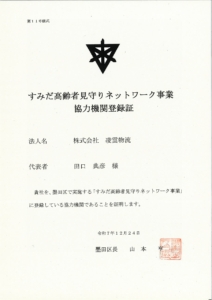 墨田区の事業者の一員として私たちにもできることをやろうと、この度「すみだ高齢者見守りネットワーク事業」の協力機関に登録しました。